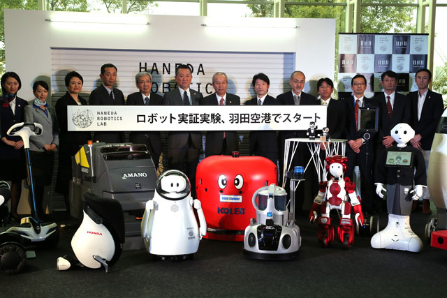 実証実験は国内線第2ターミナル2階の出発ロビー南側で、2017年2月13日まで実施。清掃ロボットは12月15日から22日、移動支援ロボットは1月10日から23日、案内ロボットは1月24日から2月13日までで、いずれも午前10時から午後4時30分までを予定している。実験開始を前にした14日は、参加する17台のロボットが勢揃いした。