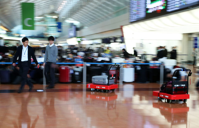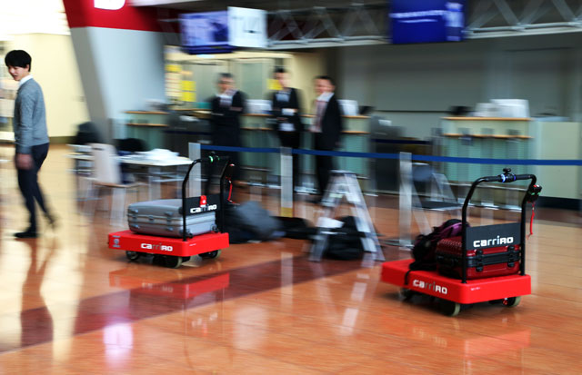 羽田で実証実験を行う台車型物流支援ロボット「CarriRo」=16年12月14日 PHOTO: Yoshikazu TSUNO/Aviation Wire