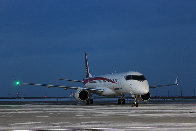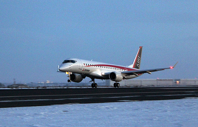 モーゼスレイクのグラント・カウンティ空港に着陸するMRJ飛行試験2号機(三菱航空機提供)