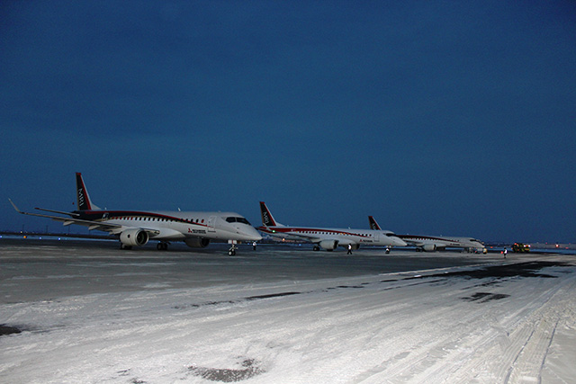米モーゼスレイクの試験拠点に並ぶMRJ飛行試験機(左から)初号機、2号機、4号機(三菱航空機提供)