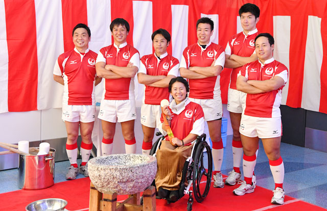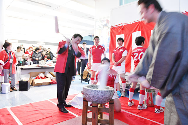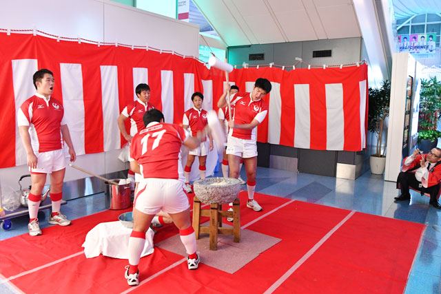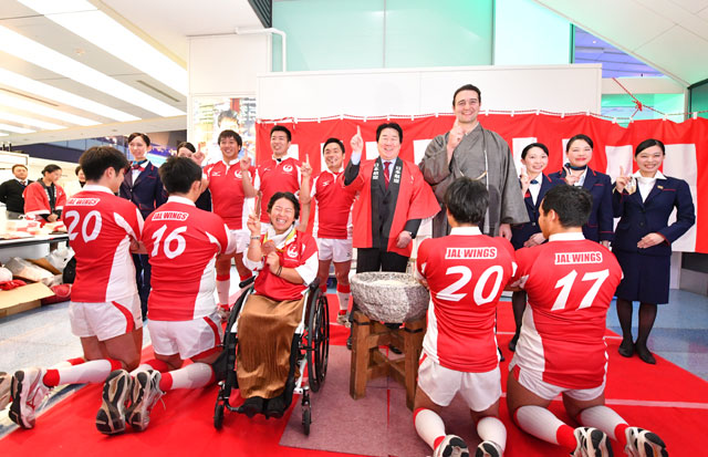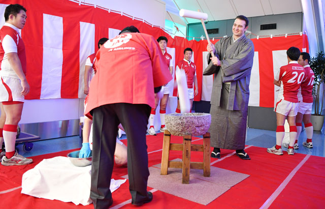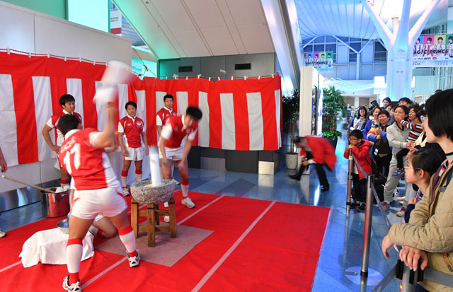 羽田空港で杵を振るった上地選手とJALラグビー部「JAL WINGS」の部員=16年12月31日 PHOTO: Tadayuki YOSHIKAWA/Aviation Wire