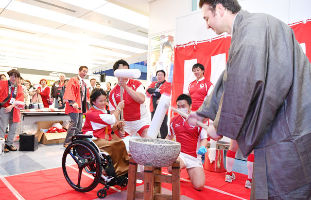 羽田空港で大相撲の鳴戸親方と餅をつく車いすテニスの上地選手=16年12月31日 PHOTO: Tadayuki YOSHIKAWA/Aviation Wire