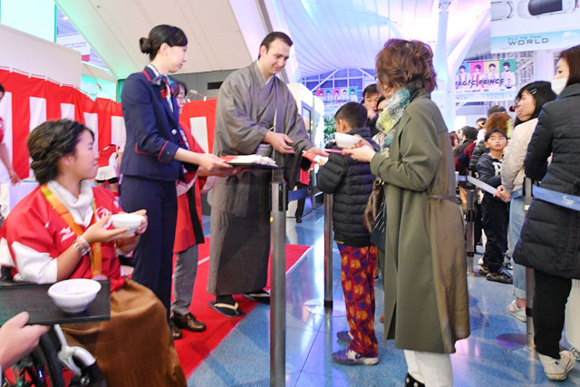 鳴戸親方からぜんざいをもらう出発客=16年12月31日 PHOTO: Tadayuki YOSHIKAWA/Aviation Wire