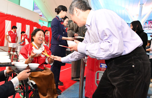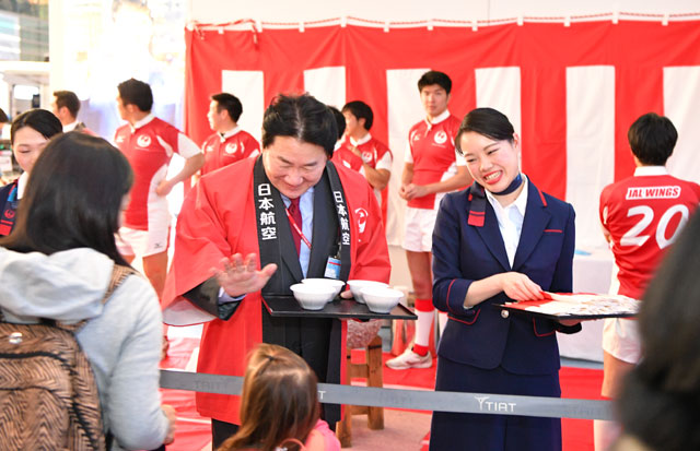 女の子にぜんざいを渡し手を振るJALの植木社長=16年12月31日 PHOTO: Tadayuki YOSHIKAWA/Aviation Wire