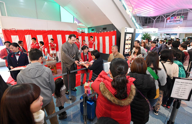 ・JAL、羽田で大晦日恒例の餅つき 逸ノ城関がサプライズ登場(14年12月31日)