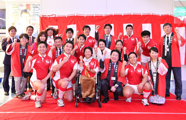 鳴戸親方や上地選手とともに写真に収まるJALの植木社長、ラグビー部員ら=16年12月31日 PHOTO: Tadayuki YOSHIKAWA/Aviation Wire