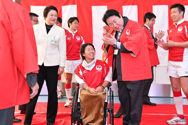 上地選手はリオで勝ち取った銅メダルを持参。ぜんざいを振る舞う行列に並んだ人たちは、年越しの“縁起もの”として銅メダルに触れていた。