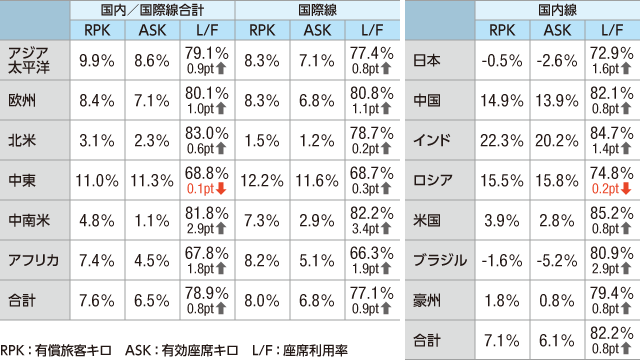 調査対象は日本を含むアジア太平洋と、欧州、北米、中東、中南米、アフリカの各地域。国際線と国内線の合計を地域別で見ると、アジア太平洋地域はRPKが