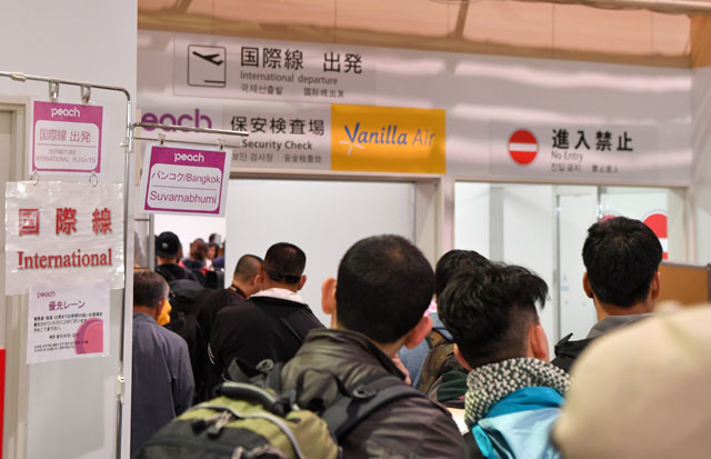 混雑する那覇空港LCCターミナルの保安検査場。出発便が重なると30分近く待つことになる=17年2月19日 PHOTO: Tadayuki YOSHIKAWA/Aviation Wire