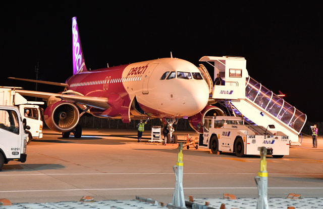 初便となった2月19日の那覇発バンコク行き初便のMM989便は、定刻の午後9時45分に乗客159人と乗員6人(パイロット2人、客室乗務員4人)を乗せて出発。機材はピーチではもっとも新しい、2016年10月に引き渡された18号機(登録番号JA818P)で、バンコクには翌20日午前0時35分に到着した。