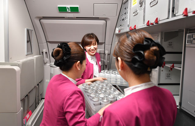 那覇発バンコク行き初便MM989便の後方ギャレーで乗客に配るシンハービールを用意するピーチの客室乗務員=17年2月19日 PHOTO: Tadayuki YOSHIKAWA/Aviation Wire