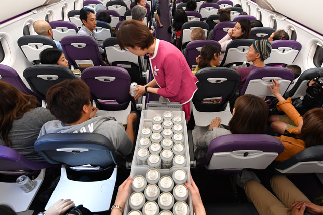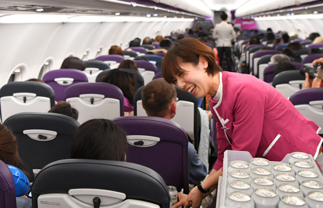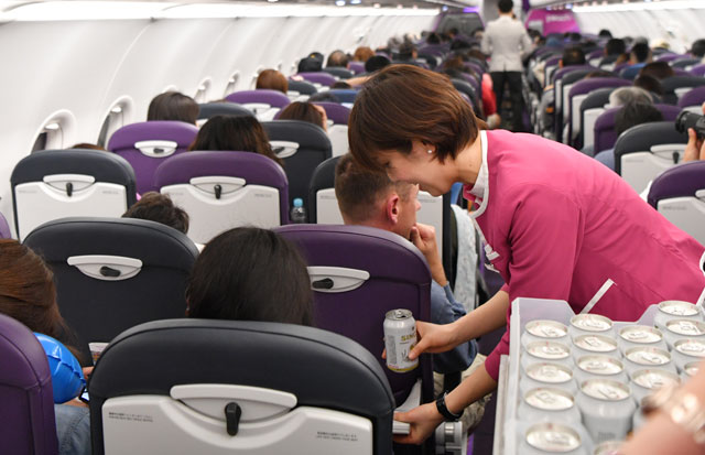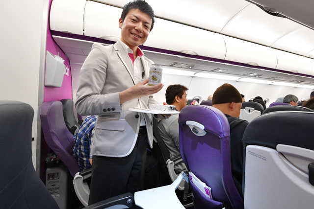 那覇発バンコク行き初便MM989便の乗客にシンハービールを勧めるピーチの客室乗務員=17年2月19日 PHOTO: Tadayuki YOSHIKAWA/Aviation Wire