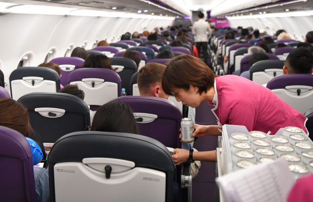 那覇発バンコク行き初便MM989便の機内でシンハービールの缶を開けるピーチの客室乗務員=17年2月19日 PHOTO: Tadayuki YOSHIKAWA/Aviation Wire