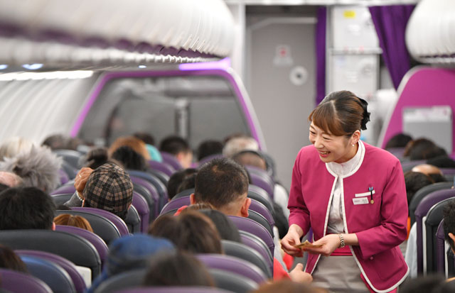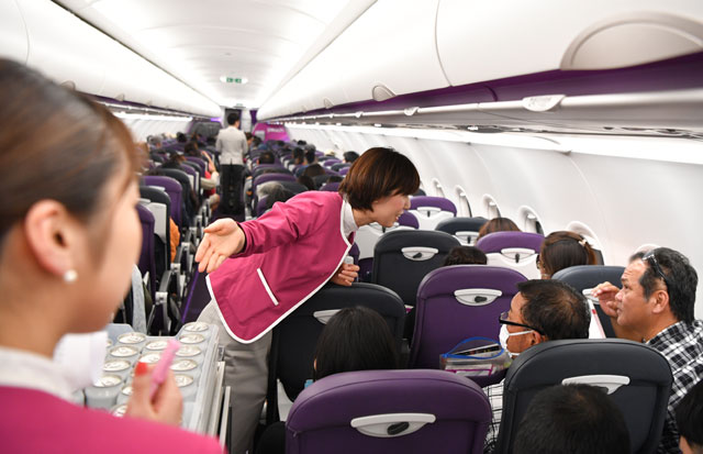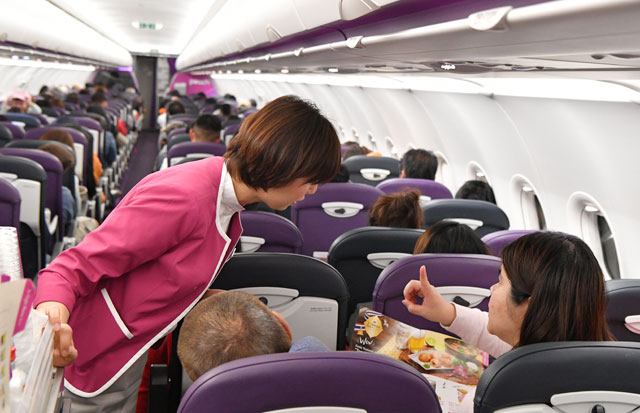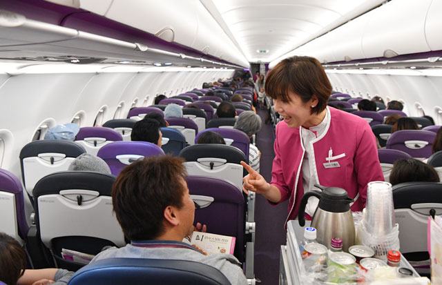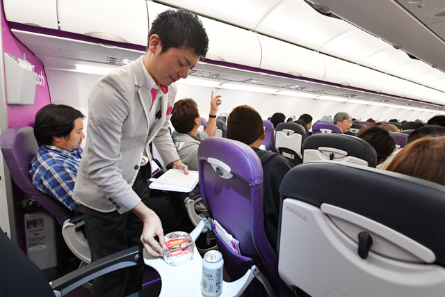 那覇発バンコク行き初便MM989便の乗客から注文を取るピーチの客室乗務員=17年2月19日 PHOTO: Tadayuki YOSHIKAWA/Aviation Wire