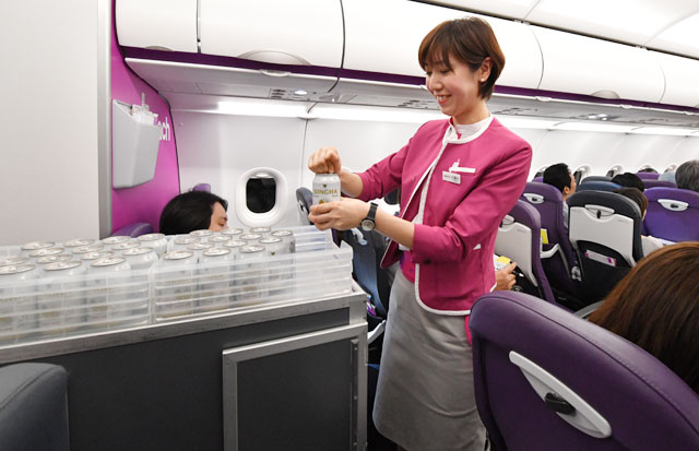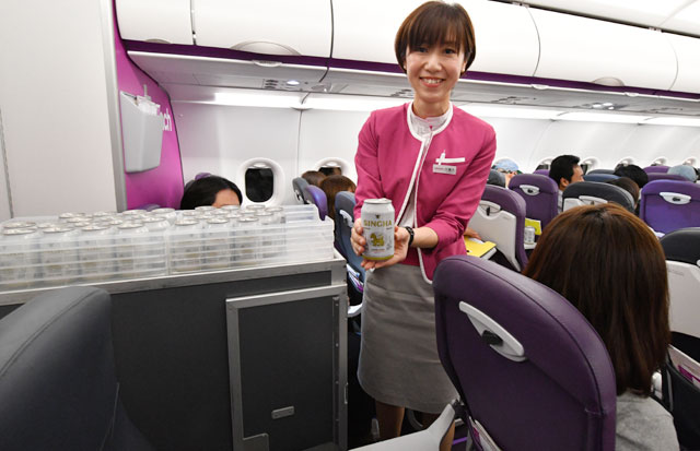 那覇発バンコク行き初便MM989便の機内でシンハービールを差し出すピーチの客室乗務員=17年2月19日 PHOTO: Tadayuki YOSHIKAWA/Aviation Wire