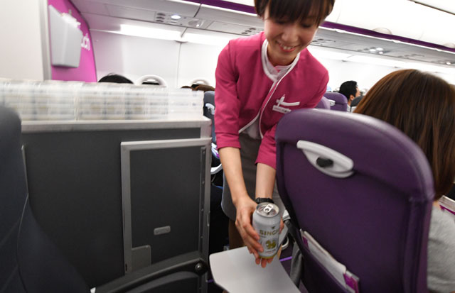 那覇発バンコク行き初便MM989便の機内でシンハービールをテーブルに置くピーチの客室乗務員=17年2月19日 PHOTO: Tadayuki YOSHIKAWA/Aviation Wire