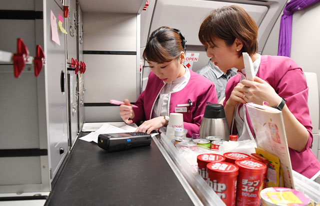 那覇発バンコク行き初便MM989便で機内販売に回るピーチの客室乗務員=17年2月19日 PHOTO: Tadayuki YOSHIKAWA/Aviation Wire