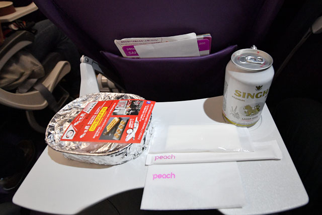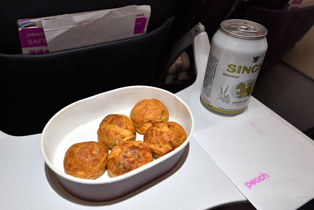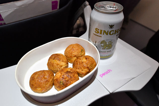 ピーチが機内販売するたこ焼き(左)とシンハービール=17年2月19日 PHOTO: Tadayuki YOSHIKAWA/Aviation Wire