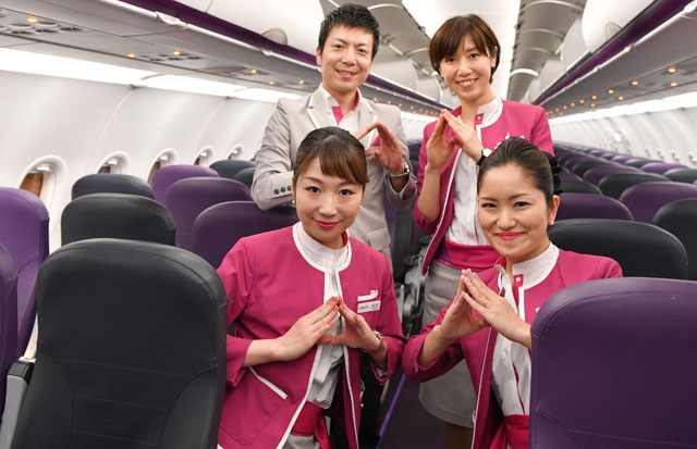 バンコクへ到着し機内でピーチポーズを取る客室乗務員の新倉さん(前列右)と松井さん(同左)、安藤さん(後列左)、大喜多さん=17年2月20日 PHOTO: Tadayuki YOSHIKAWA/Aviation Wire