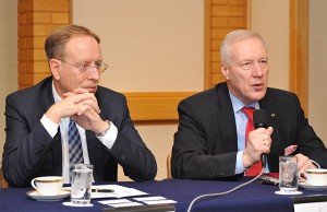 東・中部日本地区シニアダイレクター日本代表に就任したフォアヴェルク氏(左)と前任のシュトルマー前日本・韓国支社長=17年3月8日 PHOTO: Yusuke KOHASE/Aviation Wire