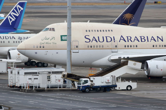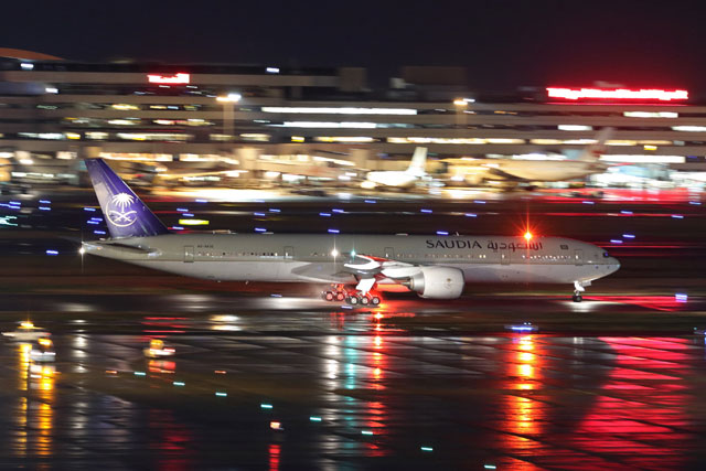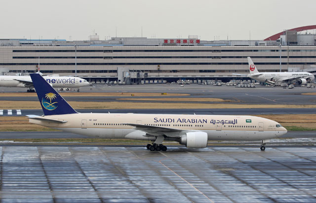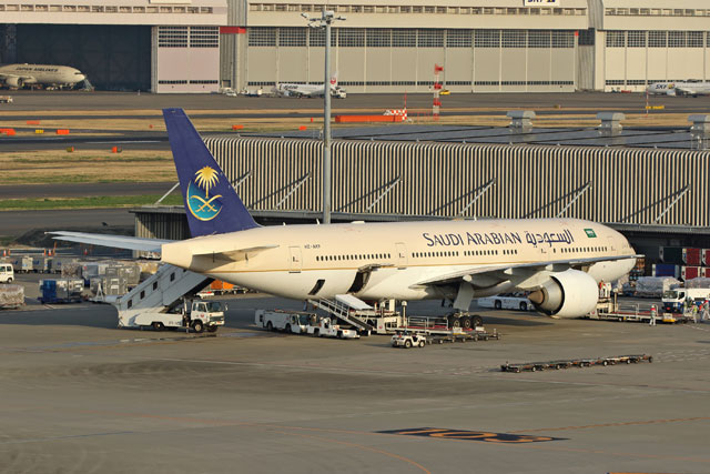 羽田の駐機場へ到着したサウディアのチャーター機777-200ER=17年3月16日 PHOTO: Shota DOKI/Aviation Wire