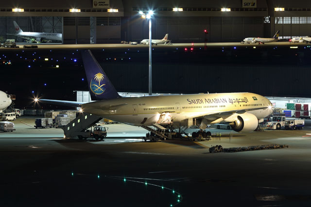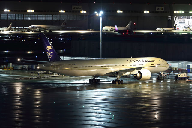 羽田で出発を待つサウディアのチャーター機777-200ER=17年3月16日 PHOTO: Shota DOKI/Aviation Wire