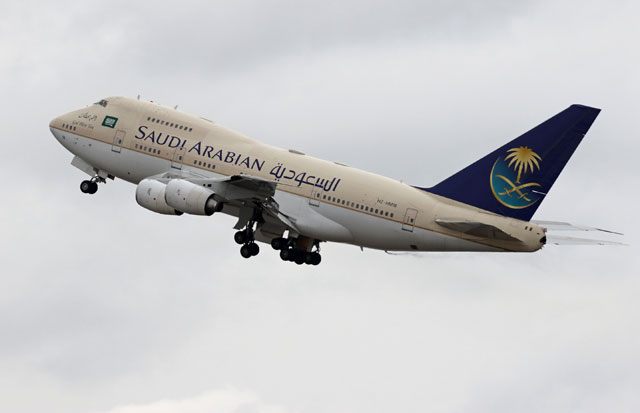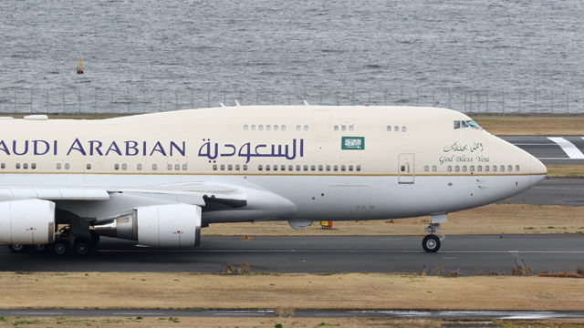 国王が搭乗した本務機は、ボーイング747-400型機(登録番号HZ-HM1)。外観上は、L2とR2ドアがつぶされている点が目立った。2001年に国営のサウディア(前サウジアラビア航空、SVA/SV)が導入した機体で、GE製CF6-80を搭載しており、2006年にサウジアラビア政府の機体となった。