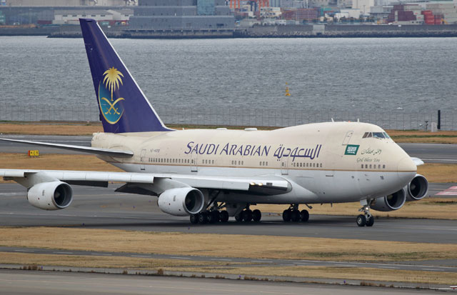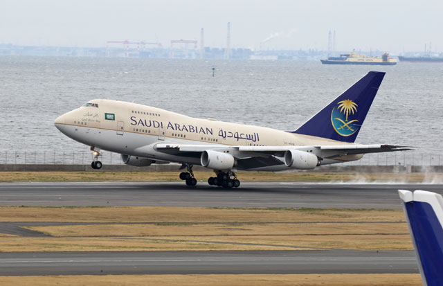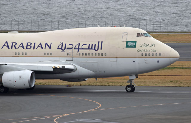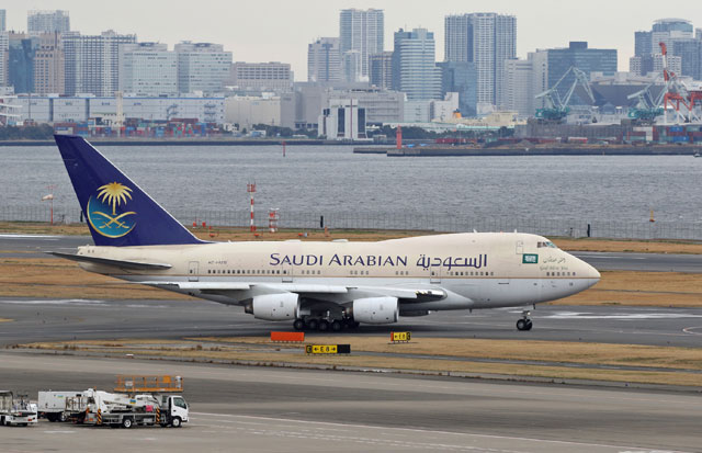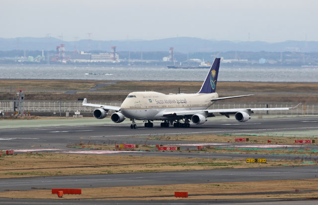 羽田を出発するサウジアラビア国王専用機の747-400=17年3月15日 PHOTO: Shota DOKI/Aviation Wire