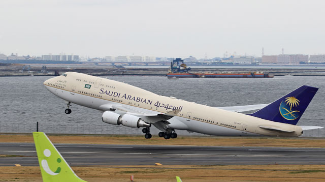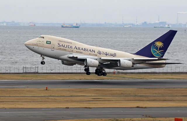 羽田を離陸するサウジアラビア国王専用機の747-400=17年3月15日 PHOTO: Shota DOKI/Aviation Wire