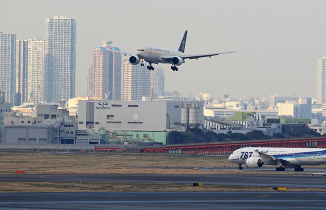 羽田へ着陸するサウディアのチャーター機777-200ER=17年3月16日 PHOTO: Shota DOKI/Aviation Wire
