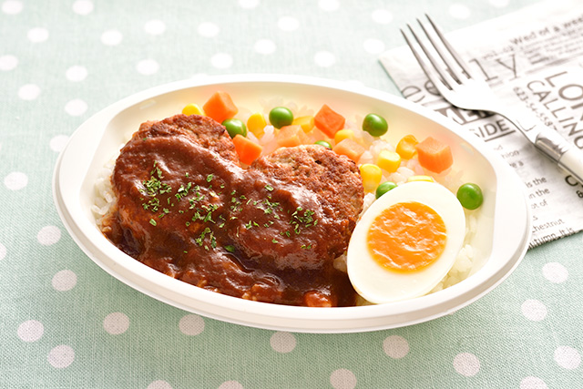 「ロコモコ風バニラエアごはん」は、2つのハンバーグにデミグラスソースをかけ、ゆで卵を添えたカフェごはんで、バニラエア風にアレンジした。750円。
