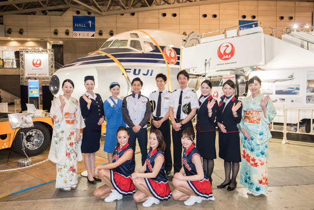 ニコニコ超会議の会場でFUJI号の前に並ぶJAL社員。前列はCA有志によるチアダンスチーム「JAL JETS(ジャルジェッツ)」の3人と、後列両端が機内サービス時の制服、後列左2人目からFUJI号運航当時の3代目制服、4代目制服、今年もダンスを披露する岡本さん、パイロット、客室乗務員=17年4月29日 PHOTO: Tatsuyuki TAYAMA/Aviation Wire