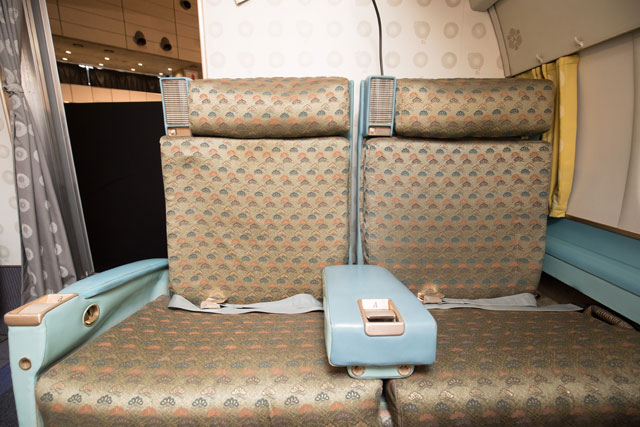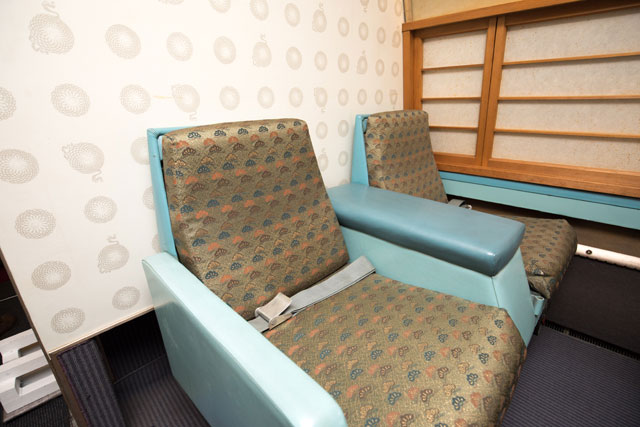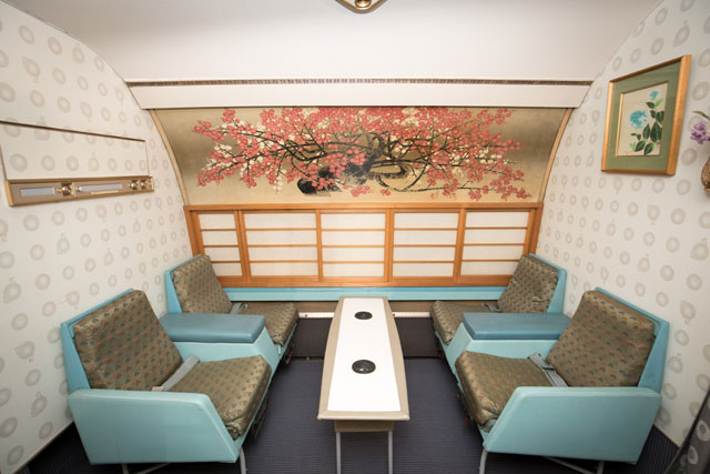 日本文化を強くアピールした客室最前部のラウンジも特徴。「空の一流ホテル」を目指し、文化勲章画家の前田青邨氏による装飾画や西陣織のシートカバー、障子、畳風カーペットなどが伝統美を演出している。現在は耐火性の基準が厳しくなり、こうした客室作りは当時ならではだ。