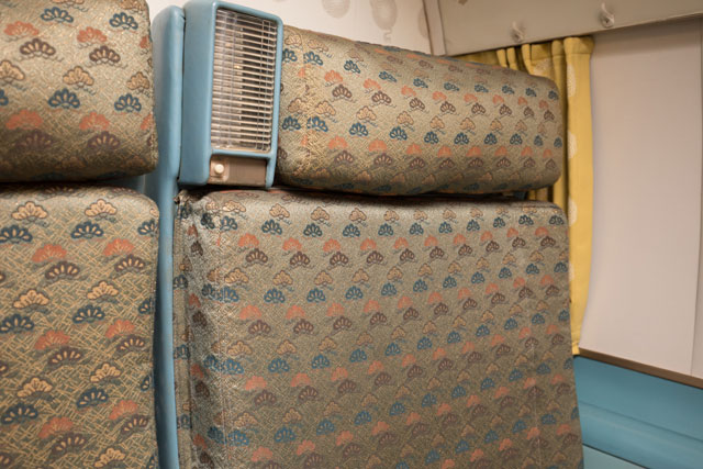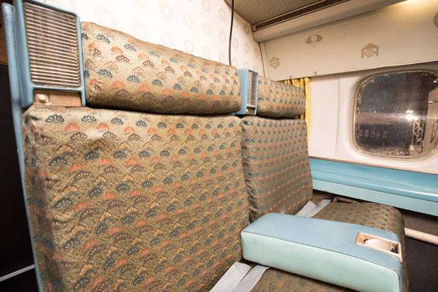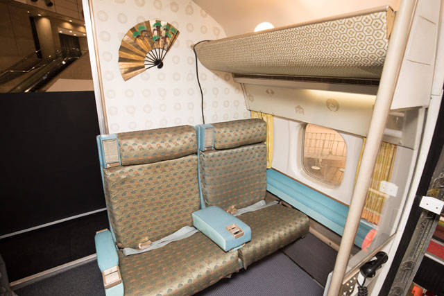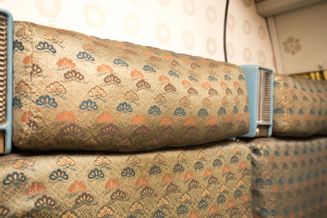 西陣織のシートカバーを用いたFUJI号のラウンジ=17年4月29日 PHOTO: Tatsuyuki TAYAMA/Aviation Wire