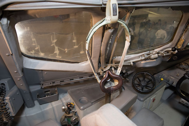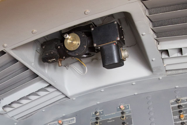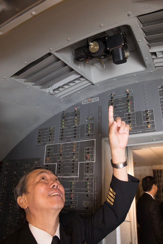 FUJI号のコックピットで航空士が使った機体の位置を割り出す天測儀を指し示すFUJI号保存会の中島さん=17年4月29日 PHOTO: Tatsuyuki TAYAMA/Aviation Wire