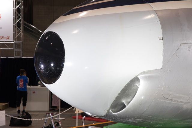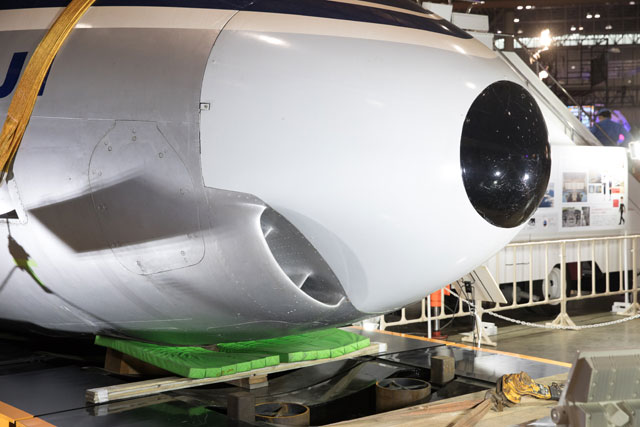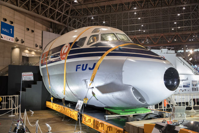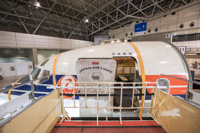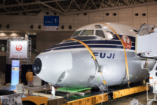 展示している機首部分は約8メートルで、コックピットとラウンジがある。一時は保管が危ぶまれた時期もあったが、社員有志などの呼びかけで存続が決まり、現在は羽田空港の格納庫に置かれている。空港外で開かれる民間のイベントへの出展は初めてで、羽田から大井埠頭(ふとう)までが陸路、車の高さ制限にかかることから習志野までが舟、会場の幕張までは再び陸送した。