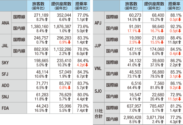 11社の発表値を合計すると、旅客数は国際線が前年比7.0%増の63万7957人で、国内線は8.5%増の299万428人。提供座席数は国際線が5.1%増の78万5487席で、国内線は2.4%増の387万1784席だった。11社平均のL/Fは国際線が1.4ポイント上昇し81.2%、国内線は4.3ポイント上昇し77.2%となった。