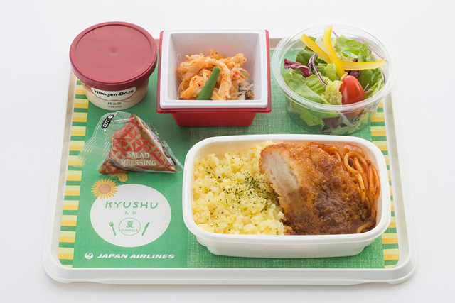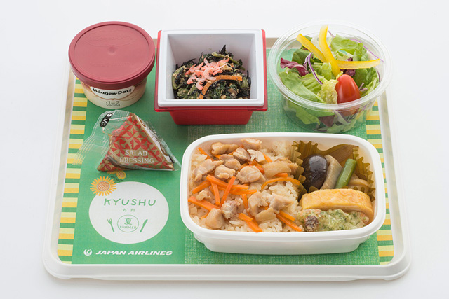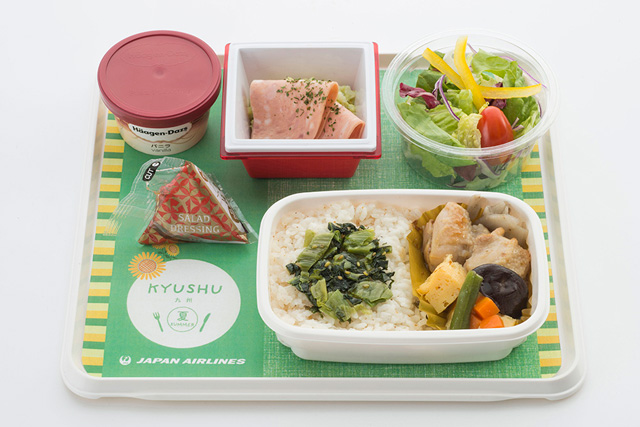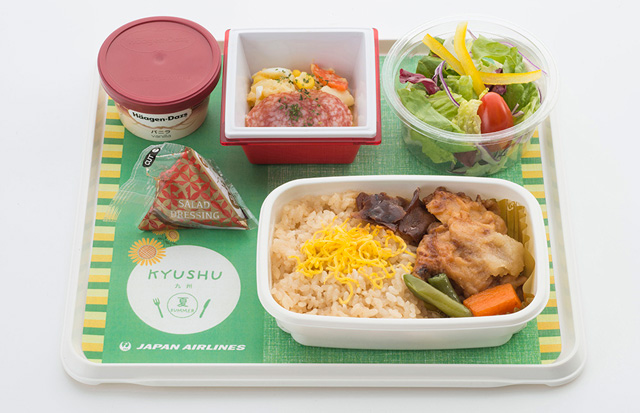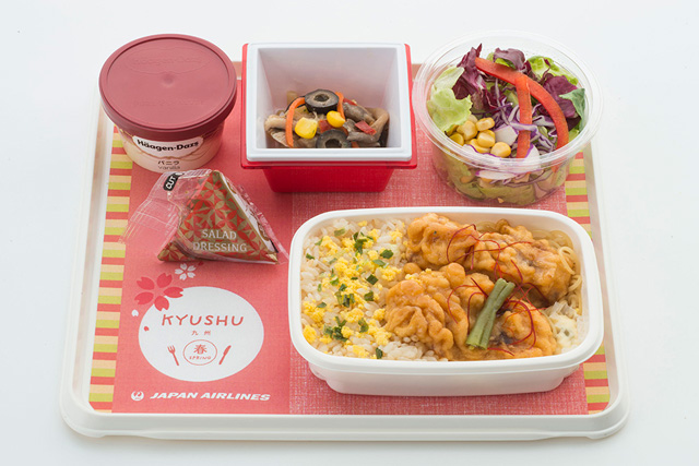 JALは2016年6月1日から、訪日客に人気の高い北海道をテーマにした機内食を、同路線で提供。九州をテーマにしたメニューの第一弾は大分県のご当地グルメ「鶏天」で、6月1日から15日まで提供する。鶏天と茶飯を合わせ、サラミとマカロニサラダの盛り合わせなどをそろえる。