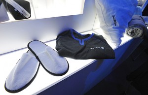 寝具はニューヨークの百貨店、サックス・フィフス・アベニューと共同開発。全便でスリッパを用意し、12時間を超える路線では、オリジナルのパジャマも提供する。