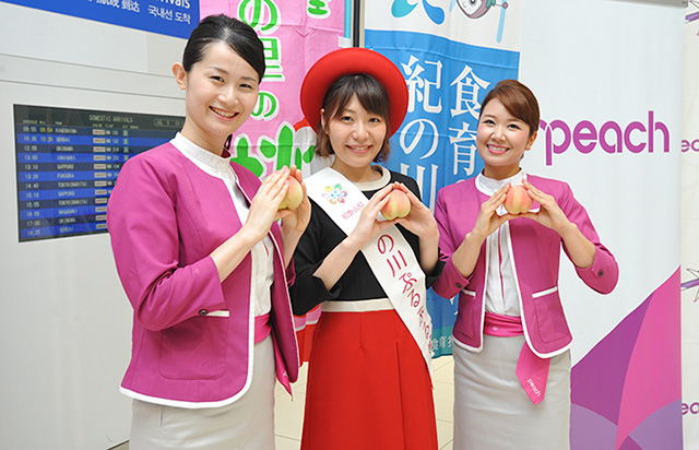 イベントには、ピーチから井上CEOのほか、和歌山出身の金澤栄次監査役と客室乗務員、和田亜沙美さんと吉森由貴さんが参加。このほか、紀の川市をピーアールする「紀の川ぷるぷる娘」の松下知佳さんと、紀の川のフルーツを宣伝するキャラクター「ももぷる」も加わり、各地からの到着客にモモを手渡した。到着客は驚いた様子でモモを受け取り、にこやかに目的地に向かった。