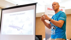機内からの高速ネット接続について説明するハネウェル・エアロスペースのネフ氏=17年7月12日 PHOTO: Tadayuki YOSHIKAWA/Aviation Wire
