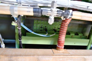 衛星と通信する屋外アンテナ底面と機内のハブを結ぶケーブル=17年7月12日 PHOTO: Tadayuki YOSHIKAWA/Aviation Wire