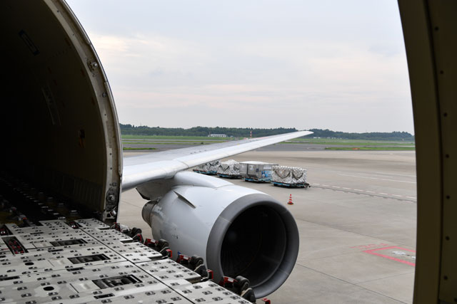 前方左側ドアが開いたANAカーゴの767-300Fの貨物室から見た成田空港の貨物エリア=17年8月22日 PHOTO: Tadayuki YOSHIKAWA/Aviation Wire