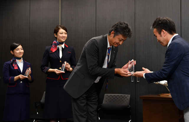 エイビーロードから贈られた盾を手に受賞を喜ぶJALの畠山部長(右から2人目)、客室乗務員(右)、地上係員(左から2人目)、司会を務めた業務部の馬場さん=17年8月31日 PHOTO: Tadayuki YOSHIKAWA/Aviation Wire