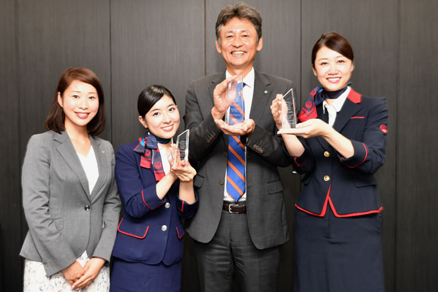 表彰式には、畠山部長や客室乗務員、地上係員に加え、利用者の声を集計している商品サービス企画本部業務部の馬場ひかりさんも司会として参加。式を終えた馬場さんは、「いつもお客様の声を集めているだけに、とてもうれしいです」と、声を弾ませて喜んでいた。