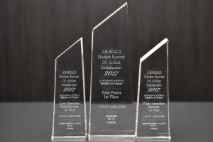JALに贈られたエイビーロードのエアライン満足度調査2017の総合満足度部門(中央)、客室乗務員の接客サービス部門(右)、空港職員のの接客サービス部門各1位の盾=17年8月31日 PHOTO: Tadayuki YOSHIKAWA/Aviation Wire