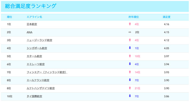 エイビーロードのエアライン満足度調査2017の総合満足度ランキング(同サイトから)