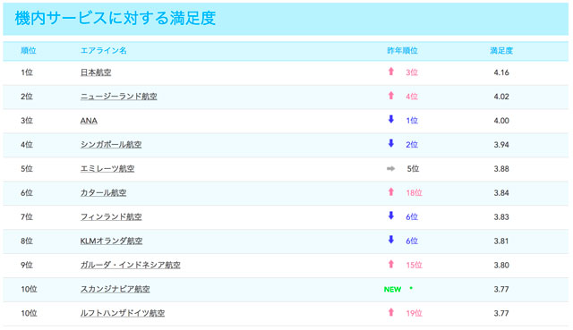 エイビーロードのエアライン満足度調査2017の機内サービスに対する満足度ランキング(同サイトから)