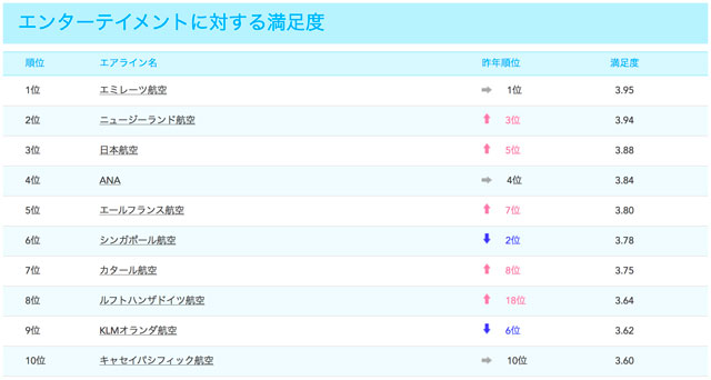 エイビーロードのエアライン満足度調査2017のエンターテイメントに対する満足度ランキング(同サイトから)