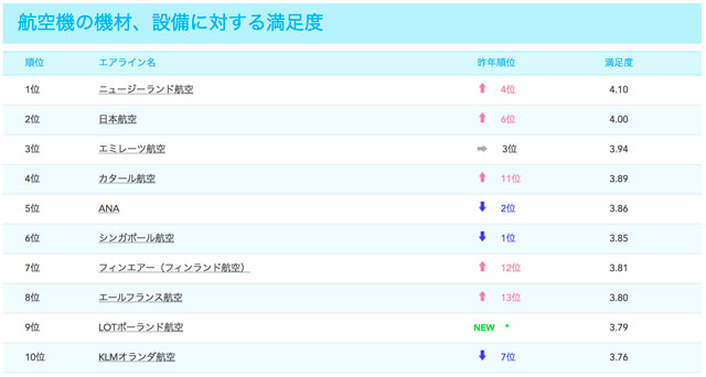 エイビーロードのエアライン満足度調査2017の航空機の機材、設備に対する満足度ランキング(同サイトから)